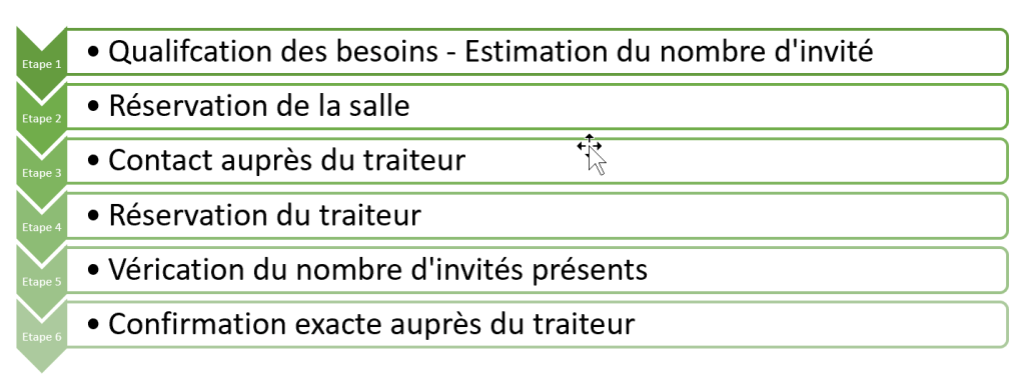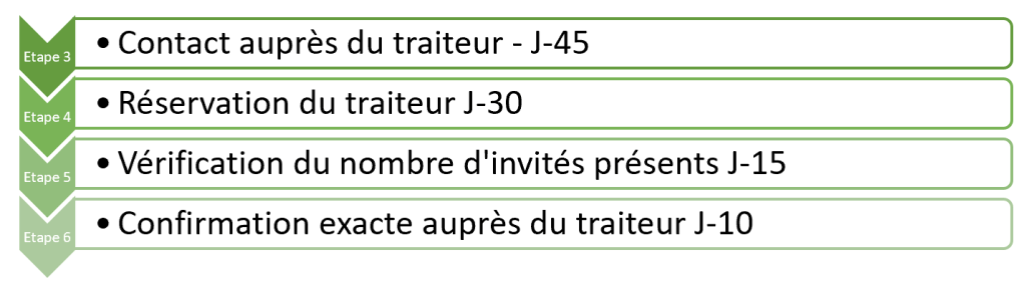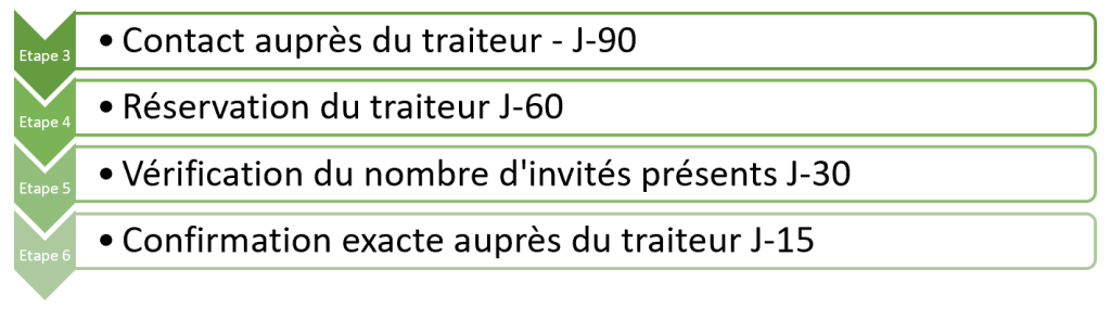 La réservation du traiteur doit d’imbriquer dans l’agenda complet que vous devez vous assigner selon la séquence ci-dessous. Selon la complexité de votre événement, les étapes liées au traiteur pourront s’enchainer sur un délai de 3 semaines à 3 mois, entre le premier contact et la confirmation définitive. La confirmation définitive s’entend par l’établissement exact du nombre de convives.