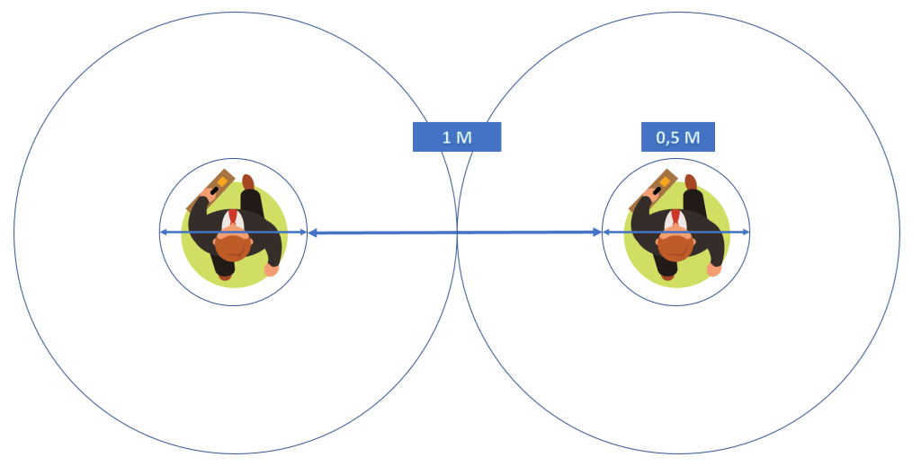 3. Vous devez donc placer vos convives tous les 1 mètre cinquante. Dit autrement, la surface nécessaire pour répondre aux normes en vigueur équivaut à un carré de 1,5 mètre de côté, soit 2,25 M2