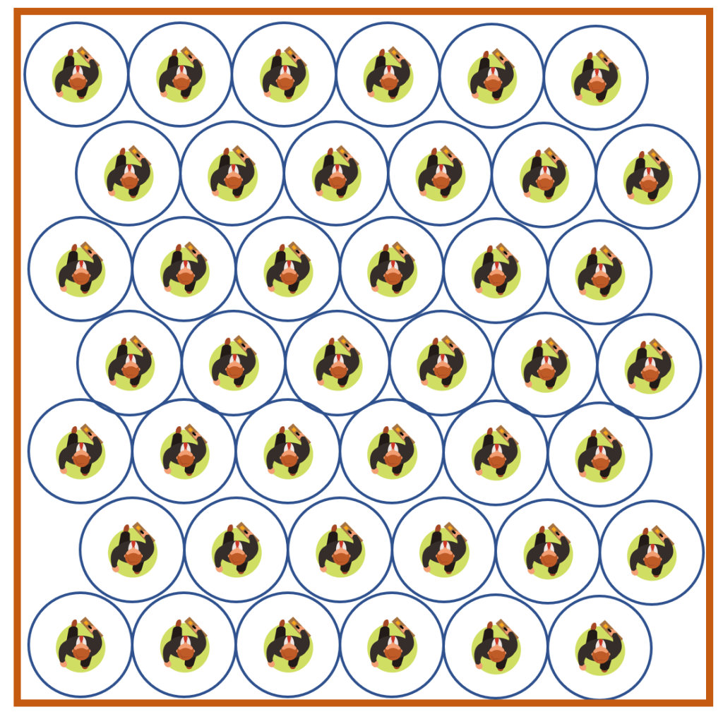 Ci-contre, par exemple, une simulation sur une salle carrée de 100 M2 => nous arrivons à placer en "alvéole" 42 invités, soit 2,38 M2. Prenons donc, pour répondre à toute situation, une valeur de travail de 2,5 M2 par convive.