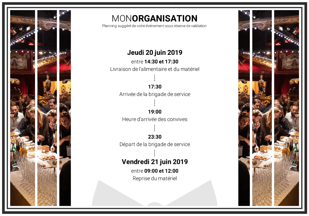Bien évidemment ce planning est adaptable à vos souhaits ou aux règles de fonctionnement du lieu de votre événement, dans la mesure de leur bonne faisabilité.