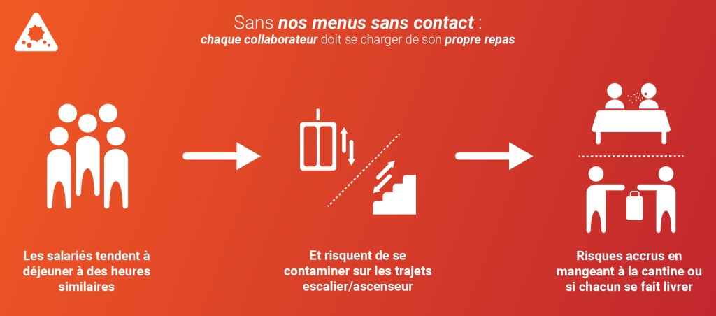 On a tendance à manger à une heure similaire, donc les déplacements pour aller manger ou récupérer son repas livré risquent de se faire au même moment. Ensuite les trajets pour se rendre aux repas sont les mêmes pour tous, et créent des attroupements. Enfin, le lieu du repas peut lui-même est un zone de concentration des contaminations.