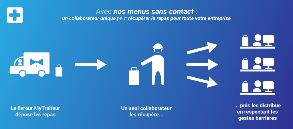 Tout d'abord, consigne est donnée au livreur de déposer les repas à l'endroit convenu avec nos clients et de s'assurer à distance de leur bonne collecte. Comme la livraison MyTraiteur se fait en une fois et pour tout le monde, il ne suffit que d'un seul collaborateur désigné pour collecter et distribuer les repas pris au bureau par les salariés. La distanciation sociale et les règles d'hygiène sont alors beaucoup plus facilement adoptées qu'avec d'autres solutions de restaurations.