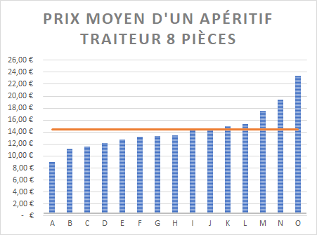 En orange la moyenne à 14,41€ H.T., en bleu la proposition par traiteurs, de A à O